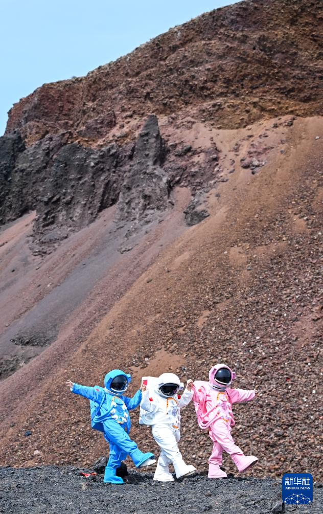 6月17日,身着宇航服装扮的游客在乌兰哈达火山群6号火山游玩。新华社记者 贝赫 摄