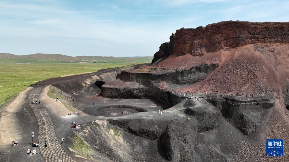 6月17日,游客在内蒙古乌兰察布市察哈尔右翼后旗内蒙古乌兰哈达火山地质公园6号火山游玩(无人机照片)。新华社记者 贝赫 摄