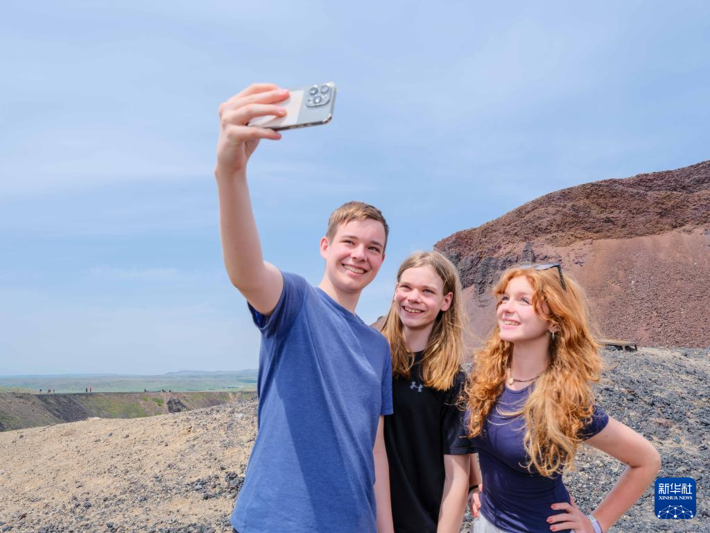 6月17日,三名美国游客在乌兰哈达火山地质公园6号火山合影。新华社记者 马金瑞 摄