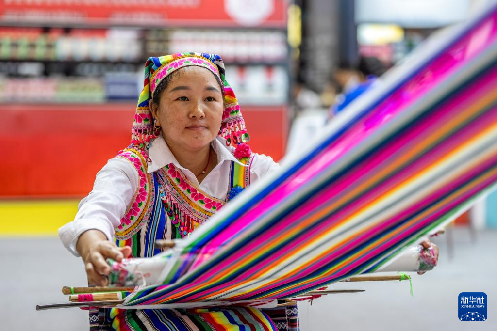 6月19日,一名独龙族妇女在第9届中国—南亚博览会上织独龙毯。新华社记者 胡超 摄