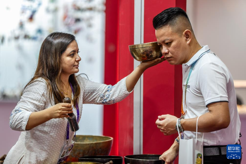 6月19日,观众在第9届中国—南亚博览会尼泊尔展区感受敲击颂钵的声音。新华社记者 胡超 摄