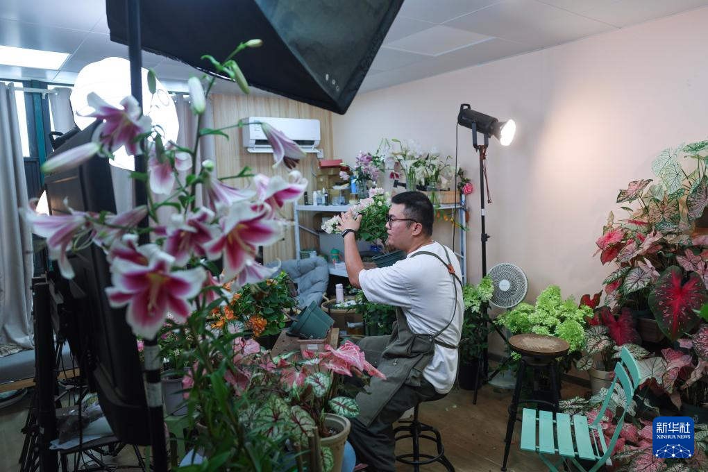 6月19日,主播在海宁市盐官镇桃园村塔莎园艺共富工坊内直播销售花卉盆景。该共富工坊成立于2020年,采取“公司+村+技术管理”的发展模式,公司发挥资金、技术与销售渠道优势,村里提供土地资源与人力支持,双方共同投资、共享经营分红。新华社记者 徐昱 摄