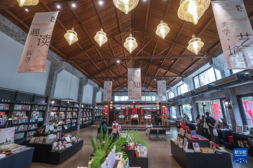 这是6月19日在海宁市盐官镇桃园村拍摄的桃源书舍内景。这座由闲置厂房改造而来的乡村书店已成为村民的文化驿站和游客的旅游打卡地标。新华社记者 徐昱 摄