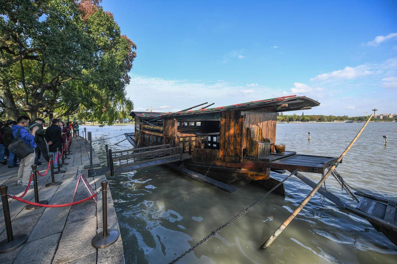 湖心岛畔,红船静卧,船头朝着太阳升起的方向,生动还原了中国共产党诞生时的场景。“习近平同志进了船舱,他有感而发,说南湖是他向往已久的地方,这次来浙江工作,第一次就来南湖参观,是非常有意义的事。”时任南湖革命纪念馆讲解员黄晓琦回忆。