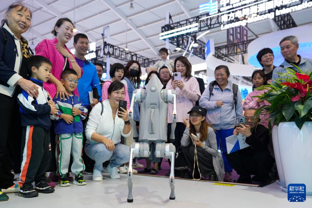6月22日,家长带着小朋友在第9届南博会上与机器狗互动。新华社记者 陈欣波 摄