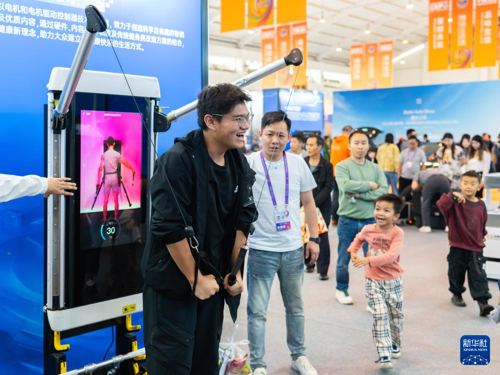 6月22日,观众在第9届南博会上体验AI力量健身器。新华社记者 高咏薇 摄