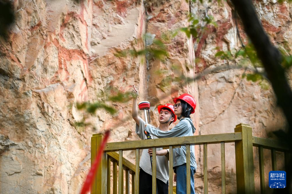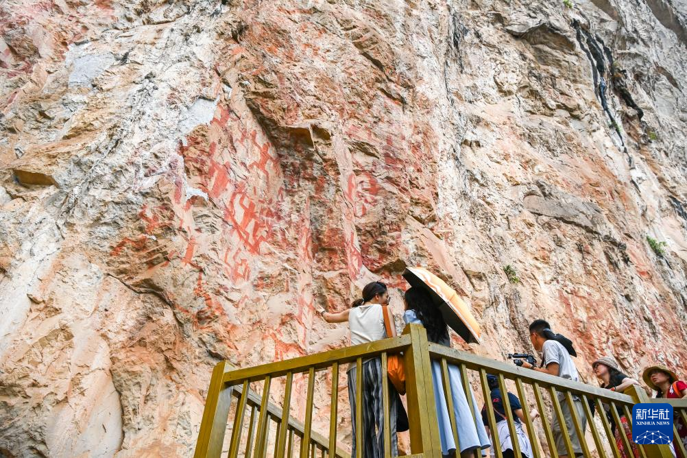 6月18日,游客在位于广西宁明县的一处花山岩画游览参观。新华社记者 曹祎铭 摄