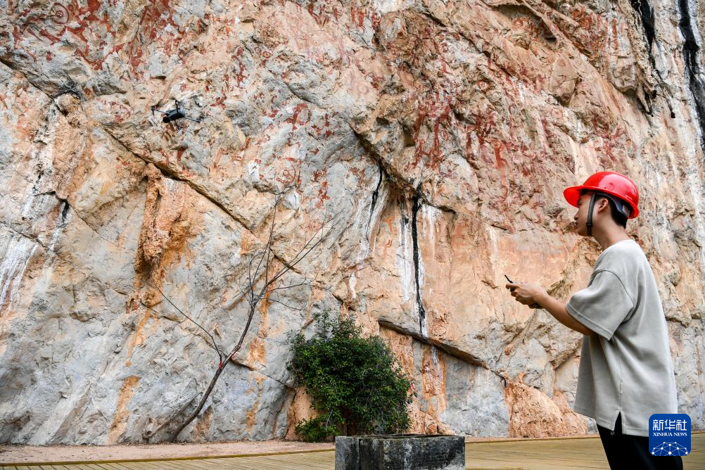 6月19日,在位于广西宁明县的一处花山岩画,工作人员使用无人机对岩壁进行拍照。新华社记者 曹祎铭 摄