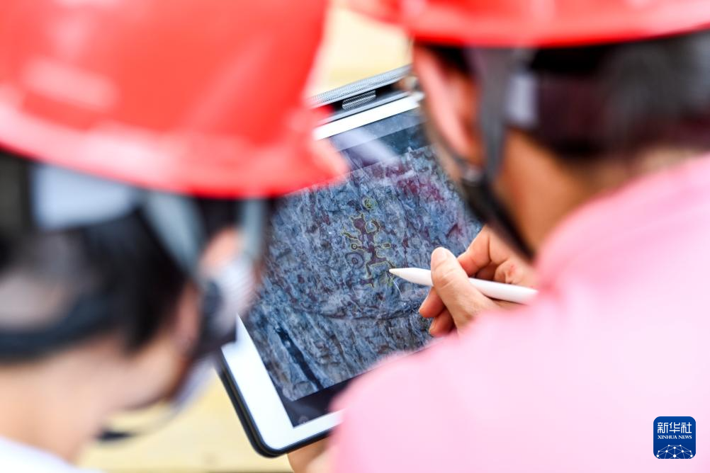 6月19日,在位于广西宁明县的一处花山岩画,工作人员对数字岩画进行补全。新华社记者 曹祎铭 摄