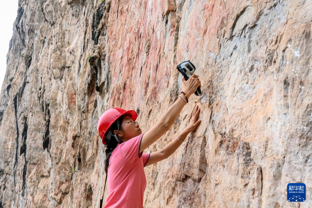 6月19日,在位于广西宁明县的一处花山岩画,工作人员对风化崩落的岩石进行检测。新华社记者 曹祎铭 摄