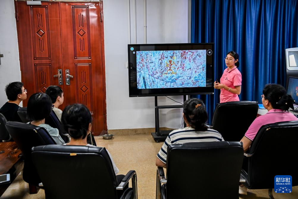 6月19日,在位于广西宁明县的花山岩画监测站,工作人员进行业务讨论。新华社记者 曹祎铭 摄