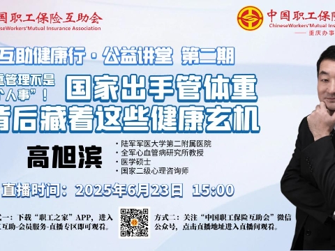 直播回顾|“互助健康行·公益讲堂”2025年第二期——体重管理不是“个人事”!国家出手管体重,背后藏着这些健康玄机 6月23日(周一)下午15:00至16:30,由中国职工保险互助会主办、中互会重庆办事处承办的2025年第二期“互助健康行•公益讲堂”——《体重管理不是“个人事”!国家出手管体重,背后藏着健康玄机》,开启线上直播。本期“互助健康行·公益讲堂”线上直播活动邀请陆军军医大学第二附属医院(新桥医院)全军心血管病研究所教授、医学硕士、执业医师、国家二级心理咨询师、重庆医学会医师学会神经内科专委会睡眠学组委员、重庆市心理健康学会理事、重庆市心理健康学会综合医院会诊专委会副主委、重庆医师协会基层医务工作者分会副会长兼心理健康学组组长、身心健康管理专家高旭滨教授,和职工会员们聊一聊体重管理对家庭、社会的重要影响,以及肥胖者的心理状态和体重超重的重要原因。