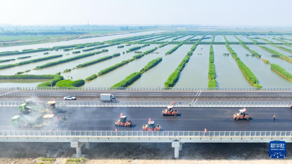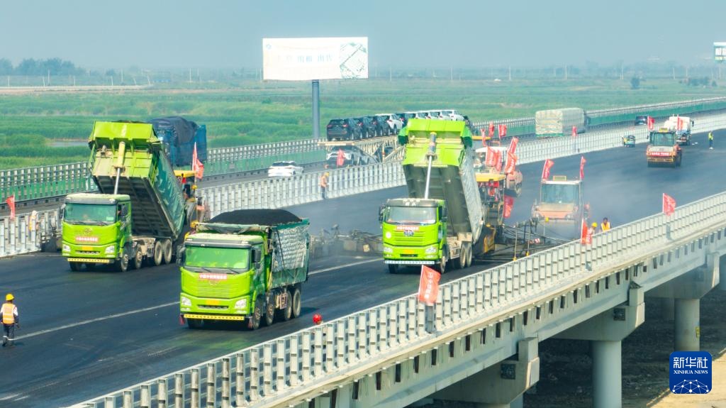 6月23日,中铁四局一公司施工车辆进行沥青摊铺作业(无人机照片)。新华社记者 杨青 摄