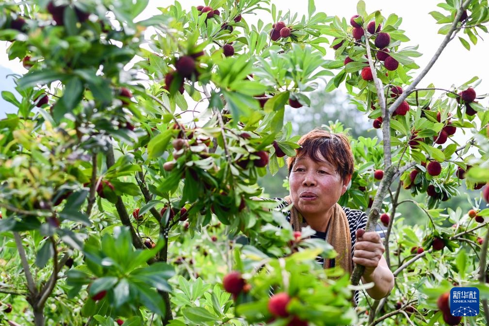 6月23日,农户在浙江省文成县环飞云湖杨梅基地采摘东魁杨梅。新华社记者 江汉 摄