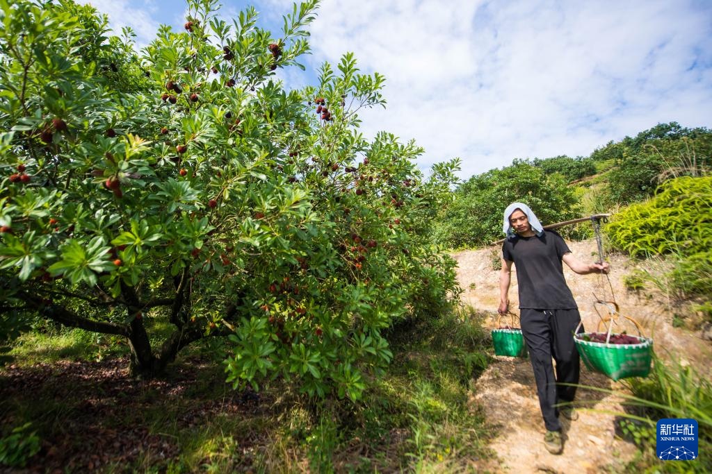 6月23日,农户在浙江省文成县环飞云湖杨梅基地搬运东魁杨梅。新华社记者 江汉 摄