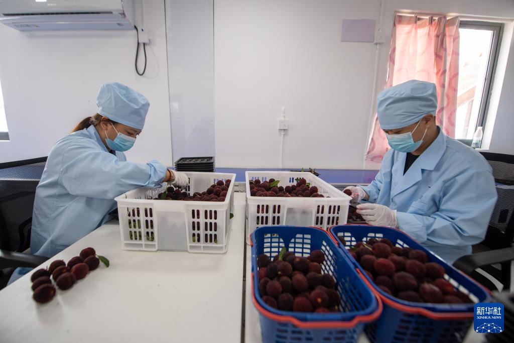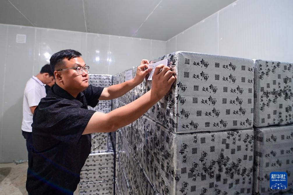 6月23日,在浙江省温州市文成县环飞云湖杨梅基地,工作人员在冷库清点东魁杨梅。新华社记者 江汉 摄