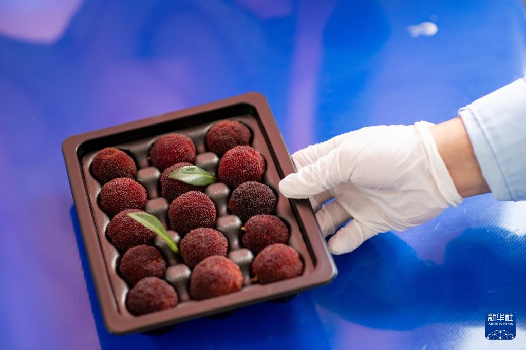 6月22日,在浙江省文成县环飞云湖杨梅基地,工作人员展示准备打包的东魁杨梅。新华社记者 江汉 摄