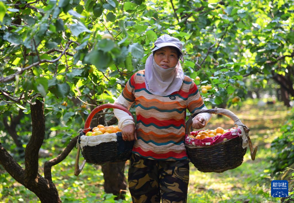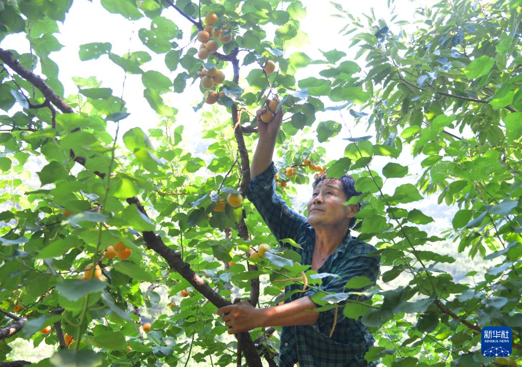 6月24日,在北京市平谷区南独乐河镇北寨村,果农采摘红杏。新华社记者 任超 摄