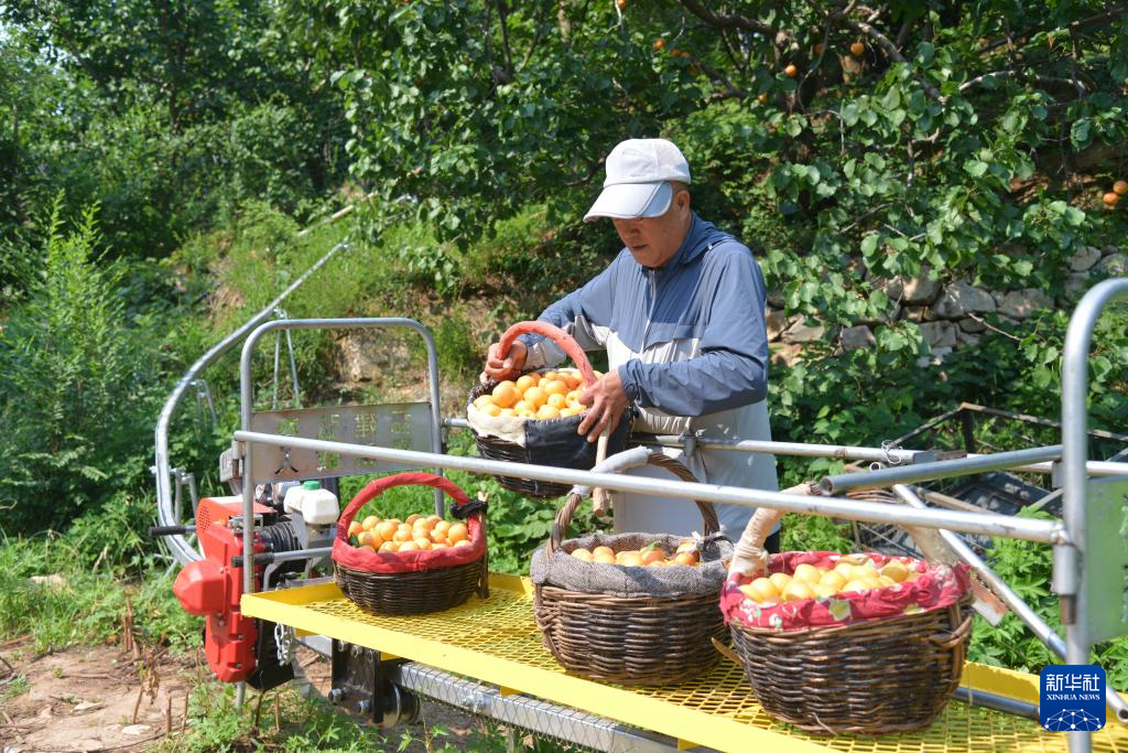 6月24日,在北京市平谷区南独乐河镇北寨村,果农通过单轨运输车将摘好的红杏运送下山。新华社记者 任超 摄