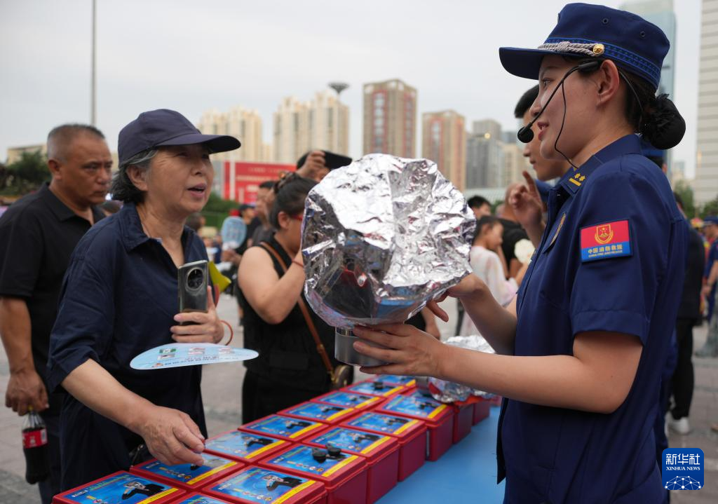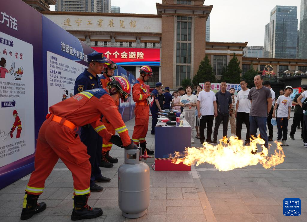 6月24日,在沈阳辽宁工业展览馆广场,消防员(左)向市民讲解燃气使用安全知识。新华社记者 李钢 摄