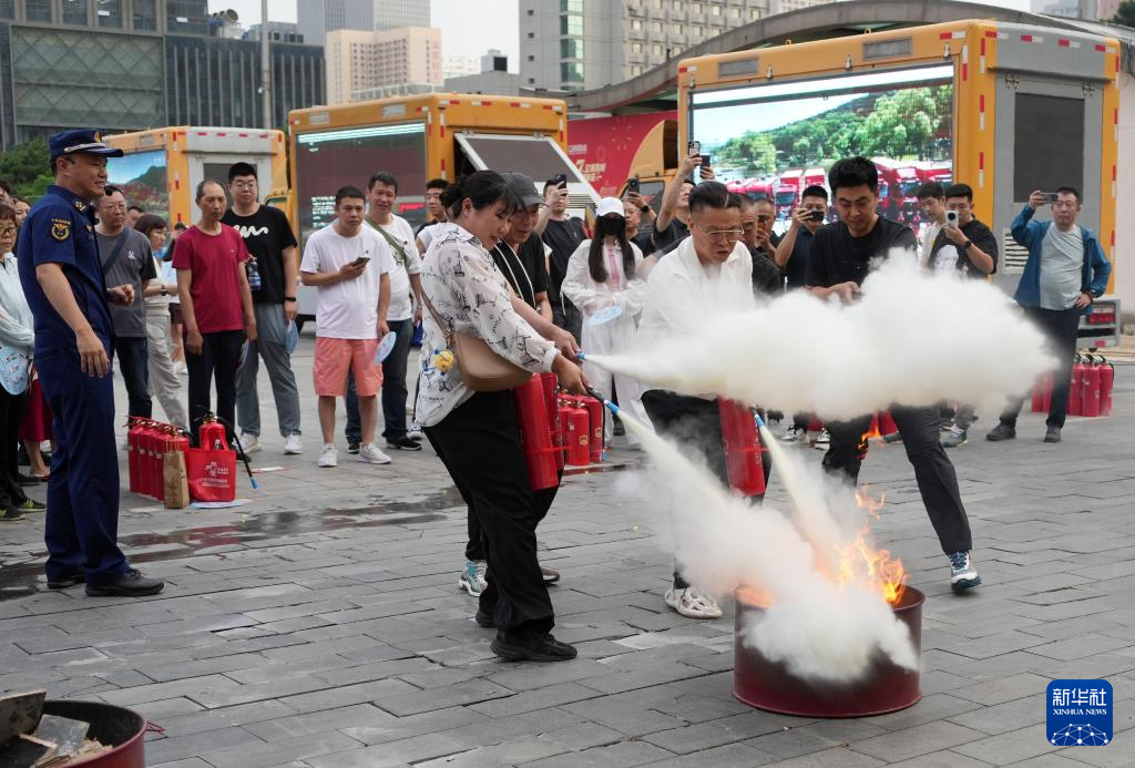 6月24日,在沈阳辽宁工业展览馆广场,市民参加灭火演练。新华社记者 李钢 摄