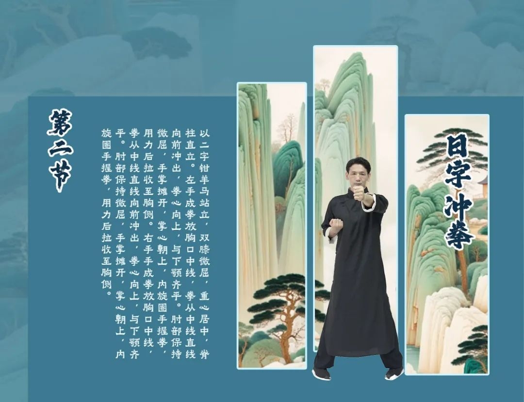 日字冲拳,拳面如日字,是咏春拳中的标志性拳法,中线出拳简洁快速,直臂转腕,圈手握拳,增强腕指力量。强调腰马合一的爆发力,其核心在于通过短距离快速发拳。