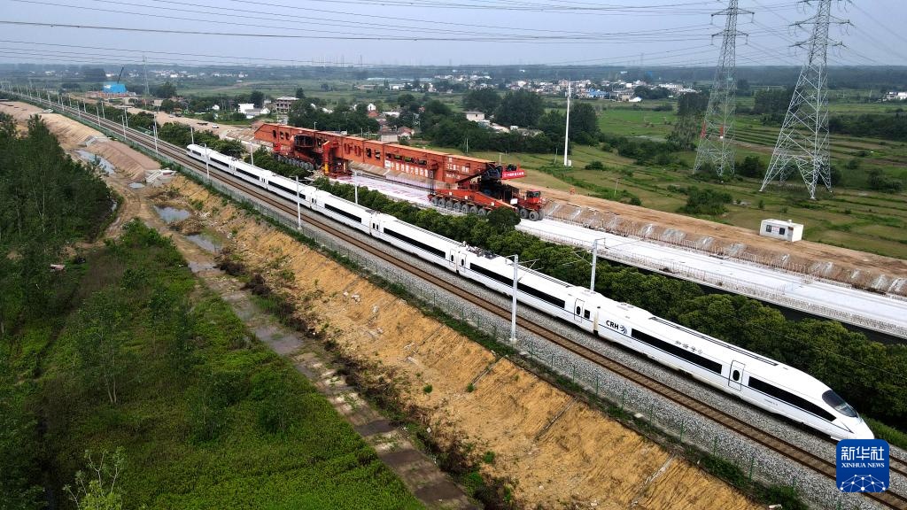 新建沪宁合高铁安徽段站前四标最后一榀40米箱梁完成架设(6月25日摄,无人机照片)。新华社记者 刘军喜 摄