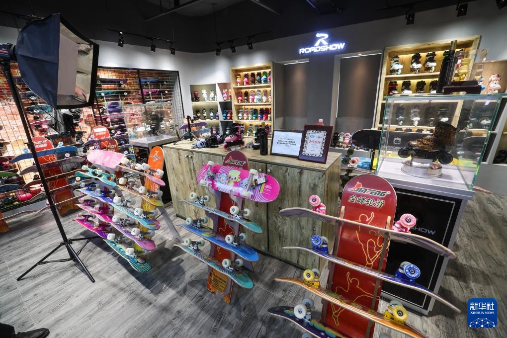 在宁波金峰文体器材有限公司的展示厅内展示的各类滑板和轮滑鞋(6月25日摄)。新华社记者 徐昱 摄