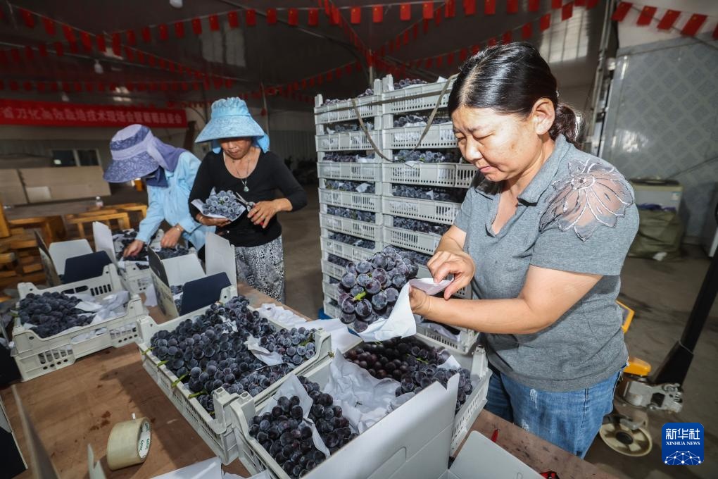 6月25日,在慈溪市坎墩街道农创园的慈溪市绿琴果蔬农场内,工作人员将采收的葡萄分拣、装盒。新华社记者 徐昱 摄