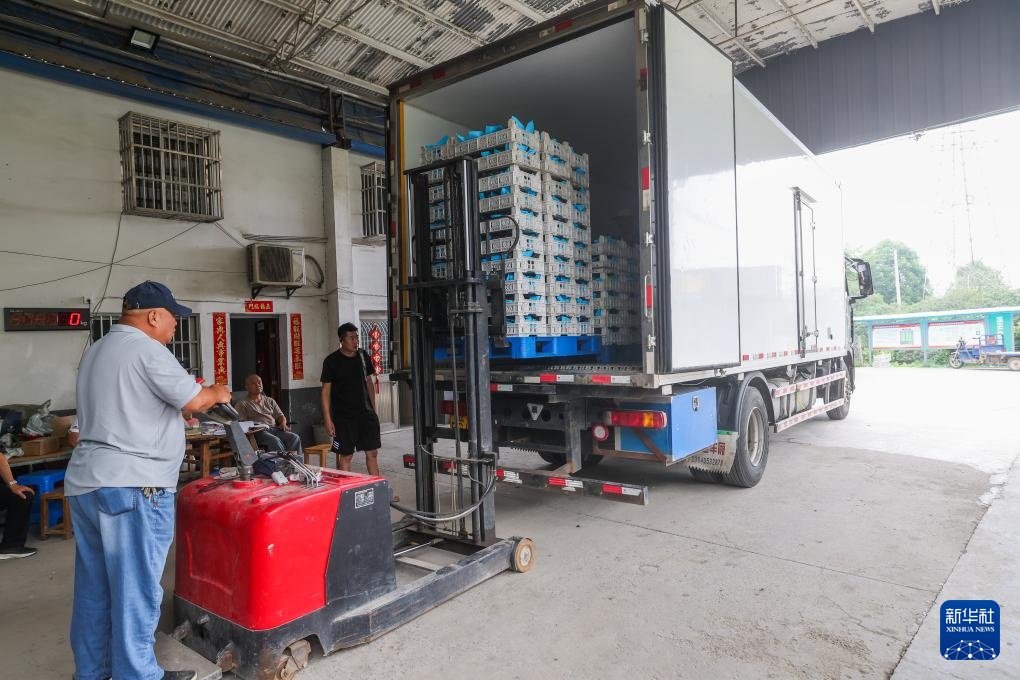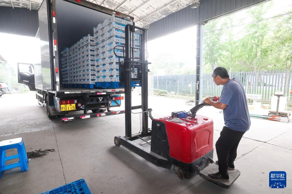 6月25日,慈溪市坎墩街道农创园的慈溪市绿琴果蔬农场内,工作人员在把采收的葡萄装车运往外地。新华社记者 徐昱 摄