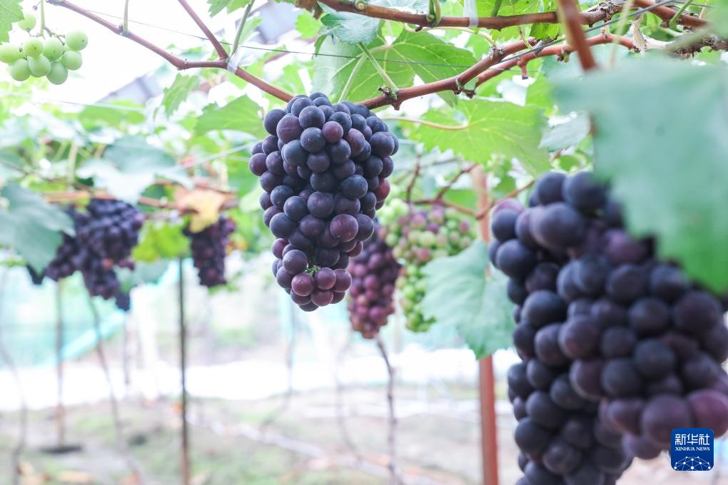 慈溪市坎墩街道农创园的慈溪市瑞辉果蔬农场大棚内,成熟的葡萄挂满枝头(6月25日摄)。新华社记者 徐昱 摄