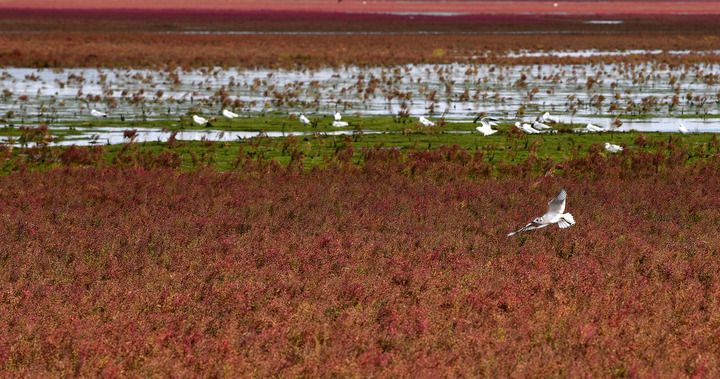 2024年9月14日,海鸟在辽宁省锦州市凌海市红海滩国家风景廊道红海滩上空飞翔。新华社记者 钱一 摄