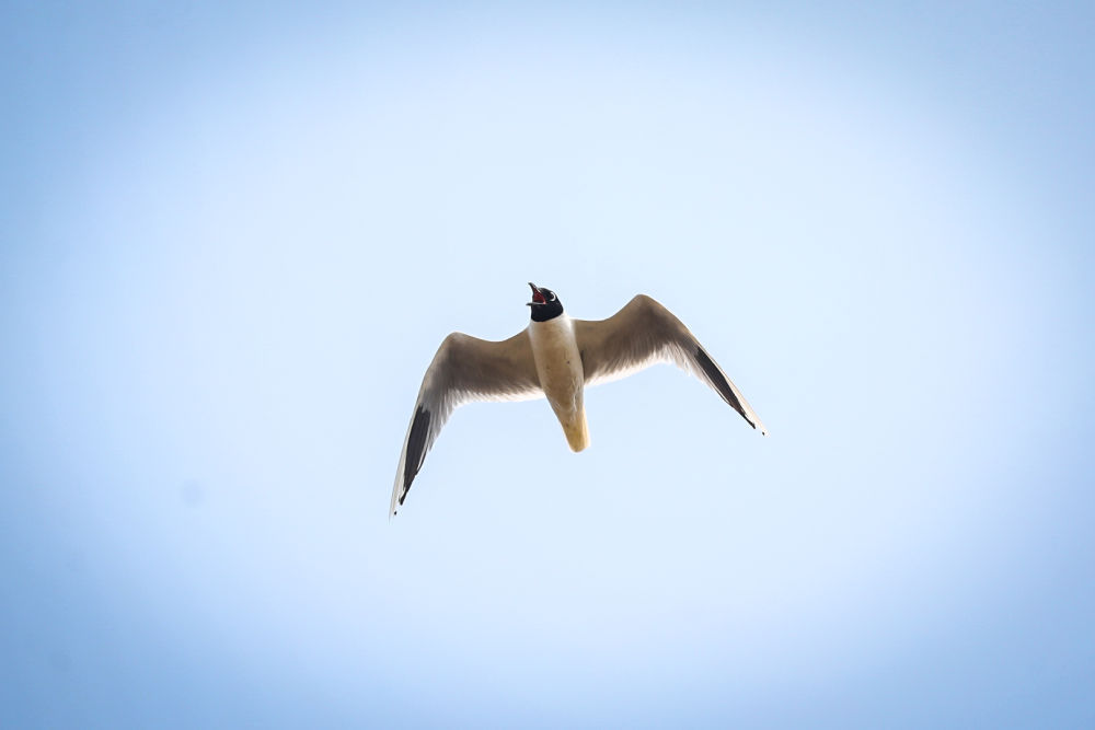 在盘锦市辽河口国家级自然保护区南小河保护站附近的湿地,黑嘴鸥在天空中飞翔(2022年6月17日摄)。新华社记者 潘昱龙 摄