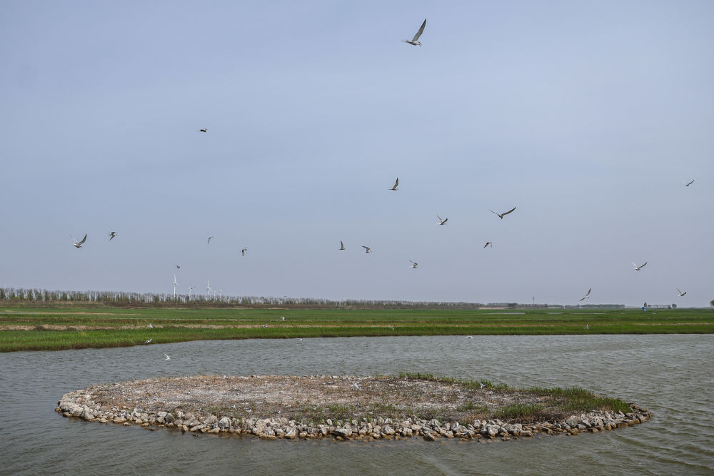 2025年5月8日,鸟类在锦州市大凌河口修复的湿地内栖息、飞翔。新华社记者 潘昱龙 摄
