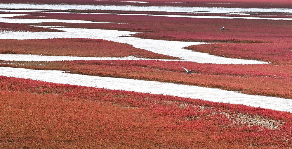 盘锦辽河口潮间带,碱蓬草向阳生长。碱蓬草不仅能固碳,还能抵御海浪侵蚀。盘锦市自然资源局副局长孙磊蹲在滩边说:“碱蓬草对生态环境很敏感,以前自然岸线破坏、海水盐度变化曾使碱蓬草大量减少,如今,大片碱蓬草到秋天就会变红,这是生态向好的最佳信号。”