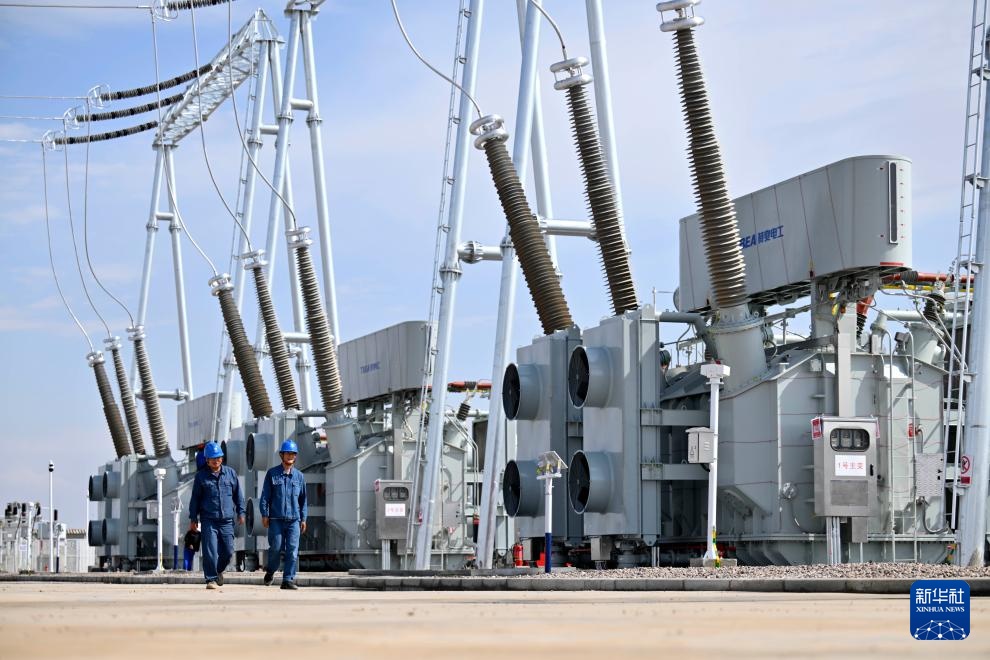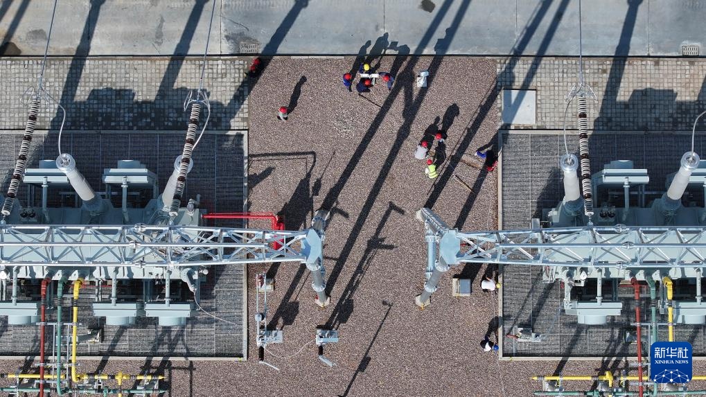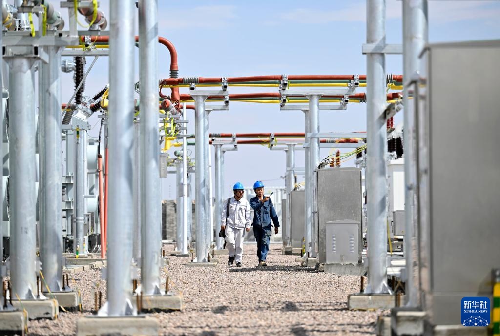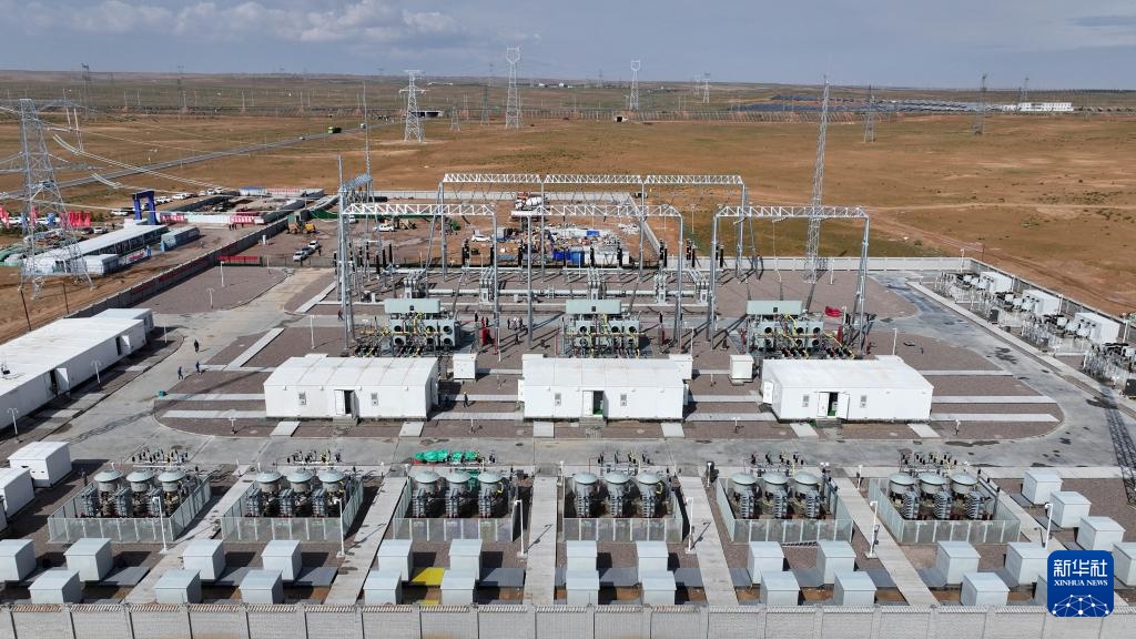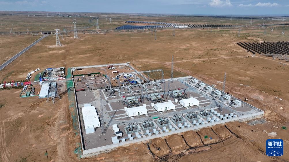 6月27日拍摄的宁国运灵武100万千瓦光伏复合项目330千伏输变电工程(无人机照片)。新华社记者 王鹏 摄