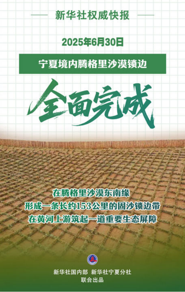 6月30日,在宁夏中卫市,宁夏境内腾格里沙漠固沙锁边工程全线贯通,在腾格里沙漠东南缘形成一条长约153公里、宽约10至38公里的固沙锁边带,宁夏境内腾格里沙漠锁边全面完成。