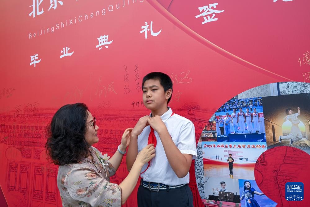 6月29日,京华实验学校校长李雪梅帮助小学毕业生整理红领巾。新华社记者 金良快 摄