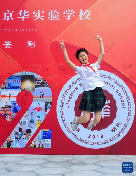 6月29日,小学毕业生在签名板前留影。新华社记者 金良快 摄