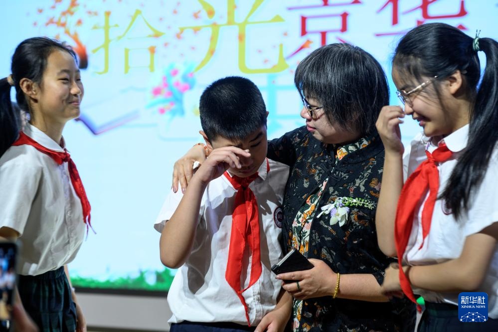 6月29日,小学毕业生与老师告别时落泪。新华社记者 金良快 摄