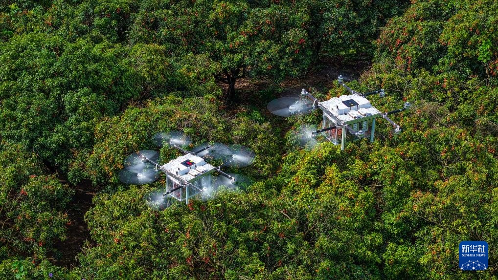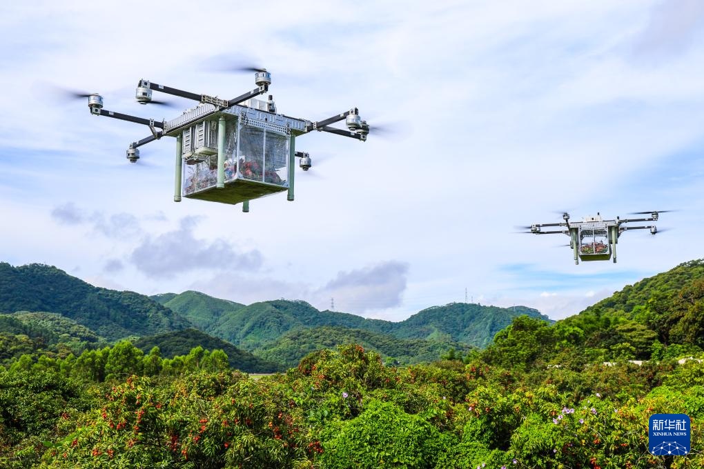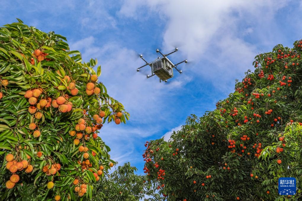 6月28日,在广州市从化区天人山水荔枝园,物流无人机运输刚刚采摘的荔枝。新华社记者 刘大伟 摄