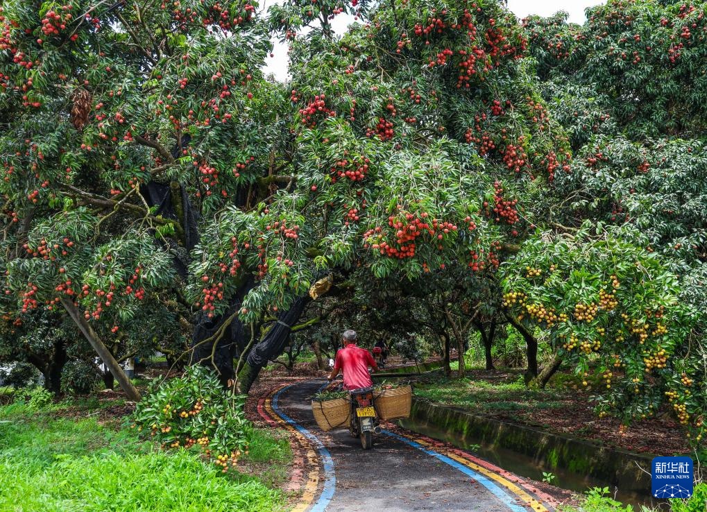 6月28日,在广州市从化区钱岗村,果农骑车运送刚刚采摘的荔枝。新华社记者 刘大伟 摄