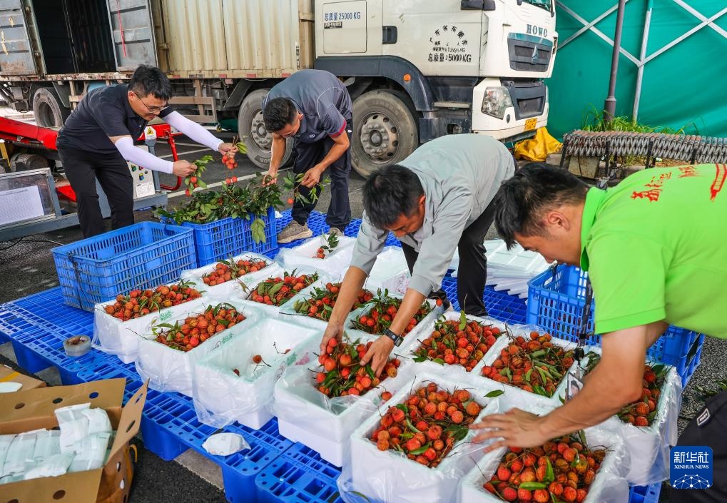 6月28日,在广州市从化区钱岗村物流服务网点,工作人员将打包好的荔枝快件送上冷藏车,准备运往广州白云国际机场航空运转枢纽。新华社记者 刘大伟 摄