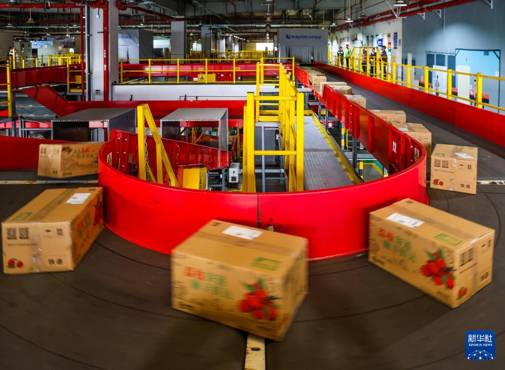 6月28日,在广州白云国际机场航空运转枢纽,荔枝快件被送上自动化矩阵分拣线。新华社记者 刘大伟 摄