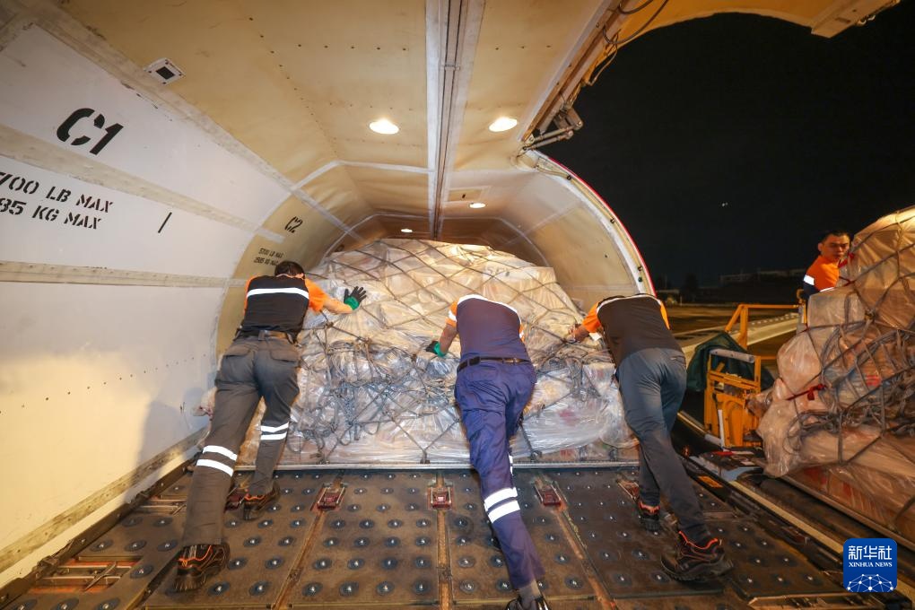 6月29日凌晨,在广州白云国际机场全货机专用停机坪,工作人员将荔枝快件组板装载进货仓。新华社记者 刘大伟 摄