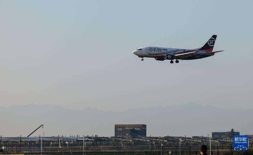 6月29日清晨,从广州起飞搭载着荔枝快件的航班准备降落西安咸阳国际机场。新华社记者 毛思倩 摄