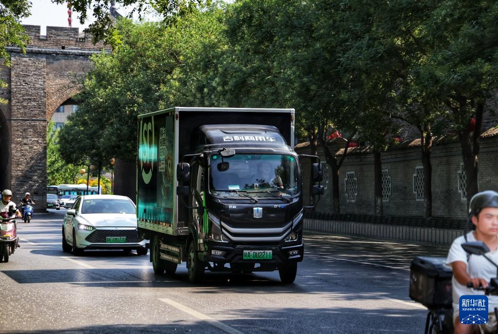 6月29日,搭载着来自广州的荔枝快件的运输车驶过西安城墙。新华社记者 毛思倩 摄