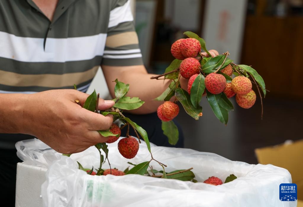 6月28日,在广州市从化区钱岗村,工作人员将荔枝分装进带有冰袋的生鲜物流泡沫箱。新华社记者 刘大伟 摄