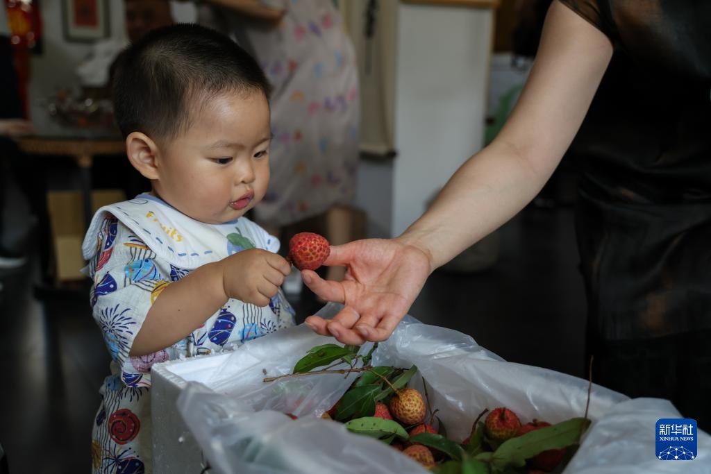 6月29日,在西安建筑科技大学,一名小朋友好奇地看着大人递来的来自广州的新鲜荔枝。新华社记者 毛思倩 摄