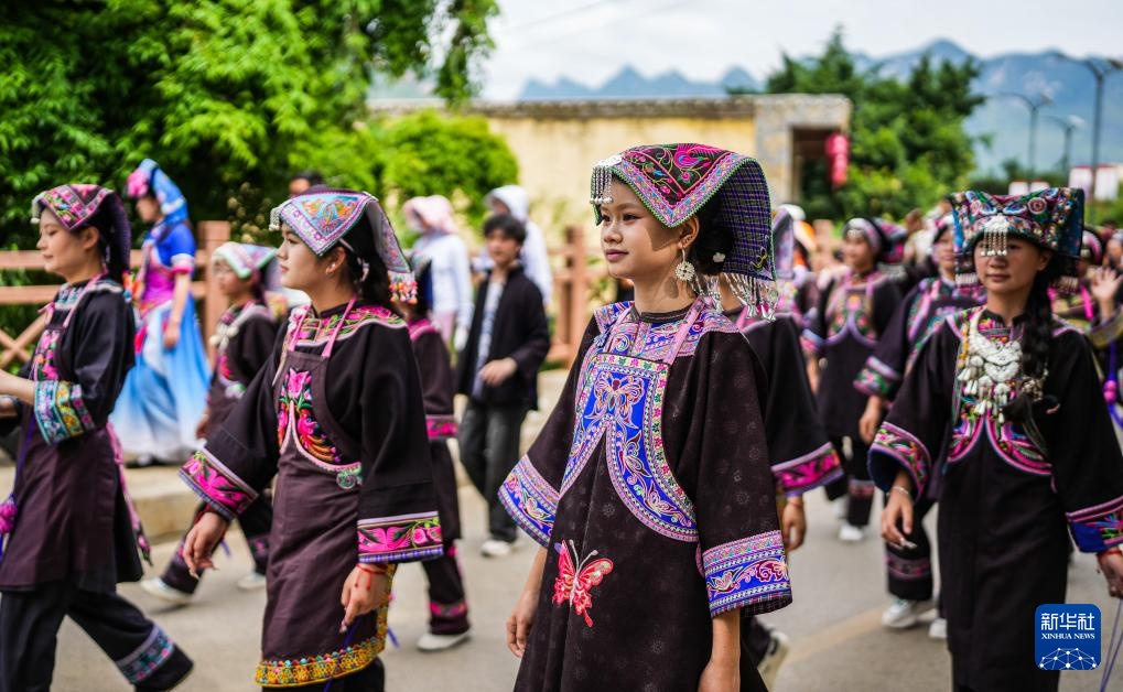六盘水市六枝特区牂牁镇的布依族群众在进行巡游(6月29日摄)。新华社记者 陶亮 摄